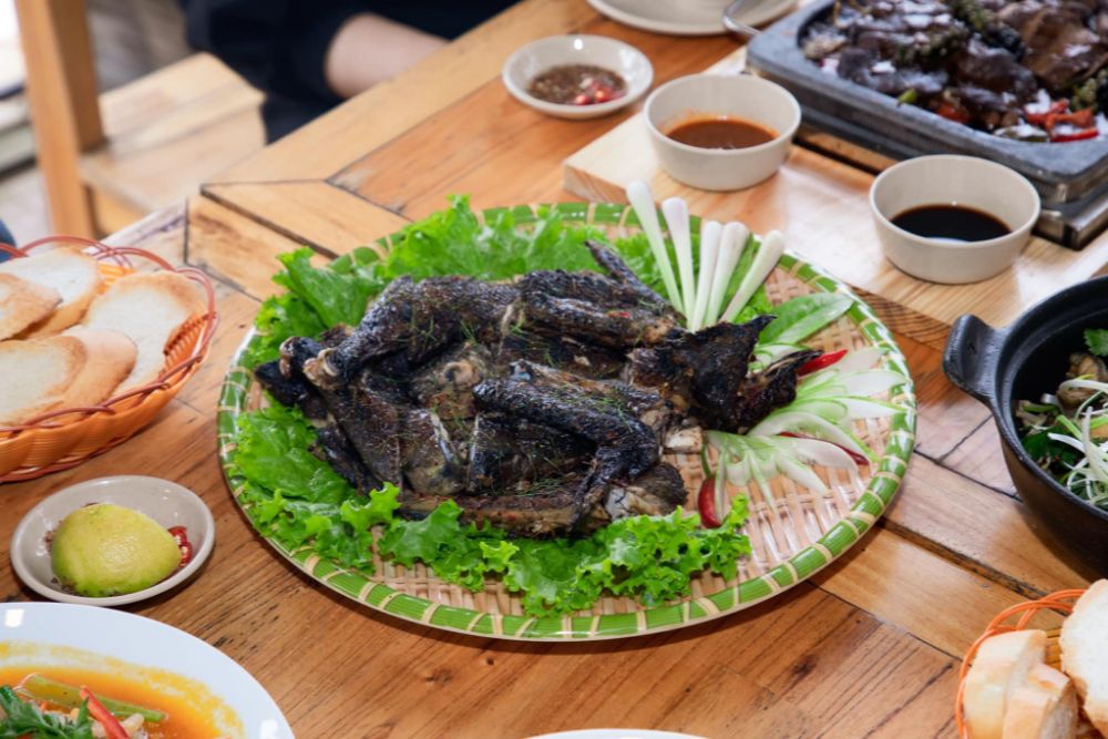Petit cochon local, assaisonné et grillé, extérieur croustillant et intérieur tendre. Spécialité des Dao.
